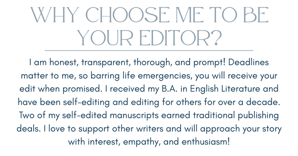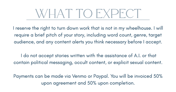 Do you have a completed work of fiction that you are hoping to publish? A vital step towards publication is getting the right set of eyes on your story and receiving thorough, honest, and professional feedback. I would love to assist you!